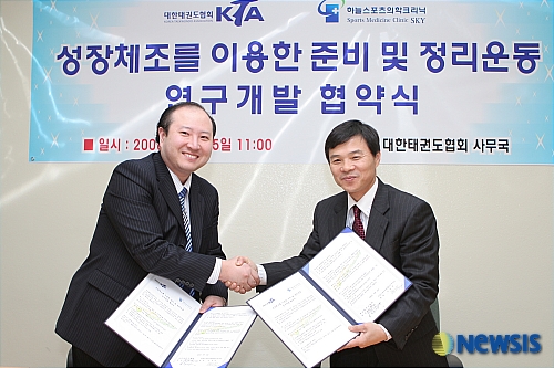 대한태권도협회 양진방 전무이사(오른쪽)와 하늘스포츠의학클리닉 연구소 조성연 원장이 15일 오전 서울 송파구 방이동 올림픽공원 협회 회의실에서 성장체조 연구개발 협약식을 체결하고 악수를 나누고 있다.