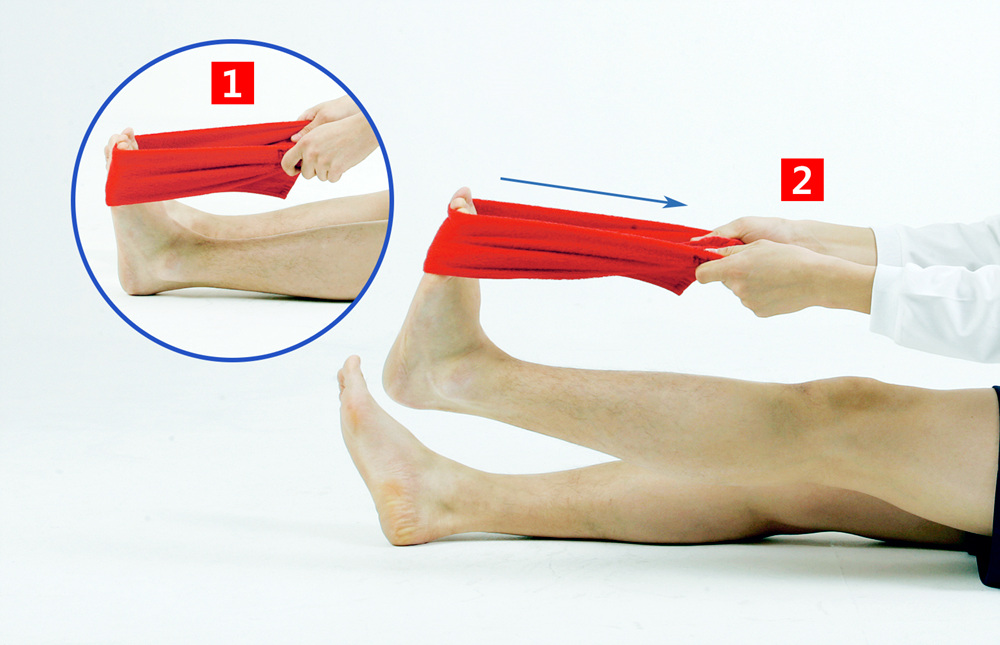1. 허리를 곧게 펴고 다리를 쭉 뻗고 앉습니다. 수건으로 한 쪽 발 위쪽을 감싸서 잡습니다.