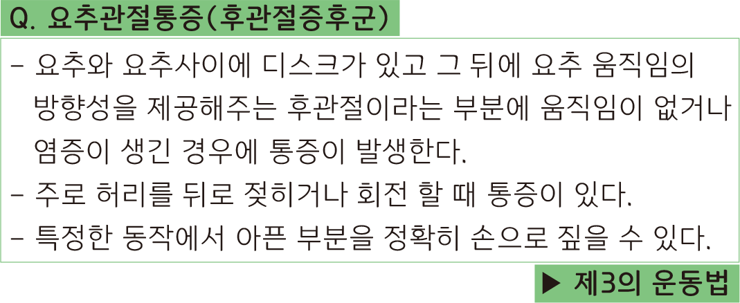 그래서 이 운동법은 주로 허리를 구부리는 동작을 통해 허리 뒤쪽의 근육을 신장시켜주고 허리 뒤쪽 공간을 증가시키는데 중점을 두었습니다.